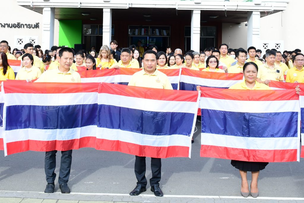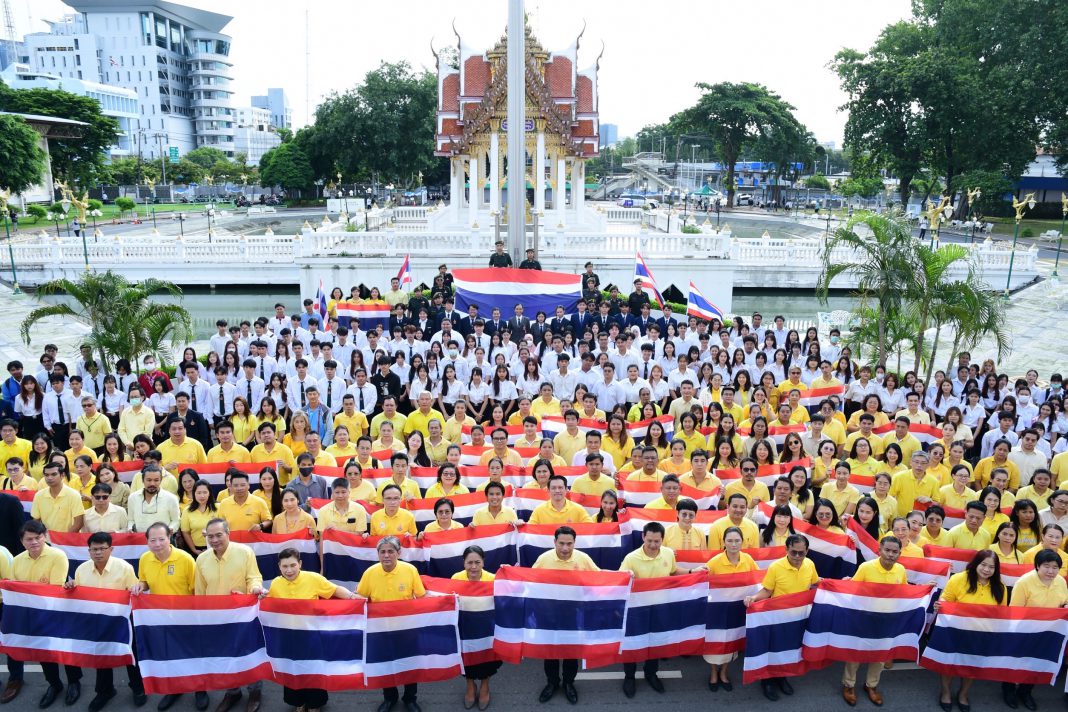 เมื่อวันที่ 6 สิงหาคม 2568 รศ.ดร.พิชัย จันทร์มณี อธิการบดีมหาวิทยาลัยเทคโนโลยีราชมงคล(มทร.)กรุงเทพ นำคณะผู้บริหาร บุคลากร และ นักศึกษา มทร.กรุงเทพ เข้าร่วมกิจกรรมแสดงพลังแห่งความภักดีและความรักชาติ “รวมใจราชมงคลกรุงเทพ หนึ่งธง หนึ่งใจ ส่งสู่ทหารไทยผู้กล้า” โดยเวลา 8.00 น. ได้ร่วมกันประกอบพิธีเชิญธงไตรรงค์ขึ้นสู่ยอดเสาอย่างสง่างาม พร้อมรวมพลังกันร้องเพลงชาติไทย เพื่อสะท้อนถึงความเป็นน้ำหนึ่งใจเดียวกันของชาวไทย และร่วมส่งกำลังใจให้กับทหารที่ปฏิบัติหน้าที่อยู่ชายแดน