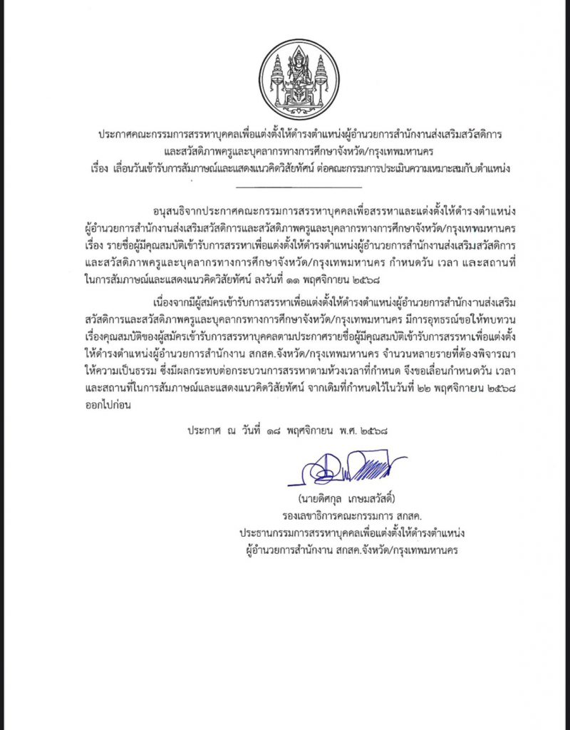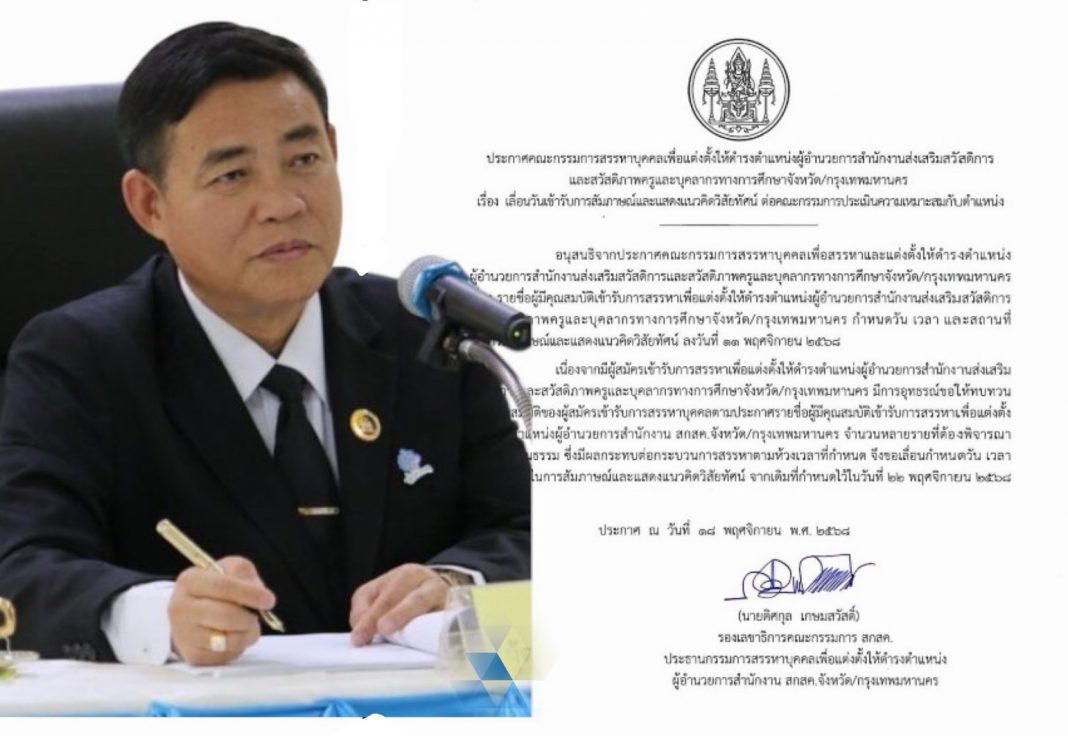 เมื่อวันที่ 18 พ.ย.2568 ผู้สื่อข่าวรายงานว่า เว็บไซต์ สำนักงานส่งเสริมสวัสดิการและสวัสดิภาพครูและบุคลากรทางการศึกษา(สำนักงานสกสค.)ได้ประกาศเลื่อนวันเข้ารับการสัมภาษณ์และแสดงแนวคิดวิสัยทัศน์ ต่อคณะกรรมการประเมินความเหมาะสมกับตำแหน่งผู้อำนวยการสำนักงานส่งเสริมสวัสดิการและสวัสดิภาพครูและบุคลากรทางการศึกษาจังหวัด/กรุงเทพมหานคร จากเดิมที่กำหนดไว้ในวันที่ 22 พฤศจิกายน 2568 ออกไปก่อนแบบไม่มีกำหนดเวลา ลงนามโดย ดร.ดิศกุล เกษมสวัสดิ์ รองเลขาธิการสำนักงาน สกสค.ในฐานะประธานกรรมการสรรหาฯ