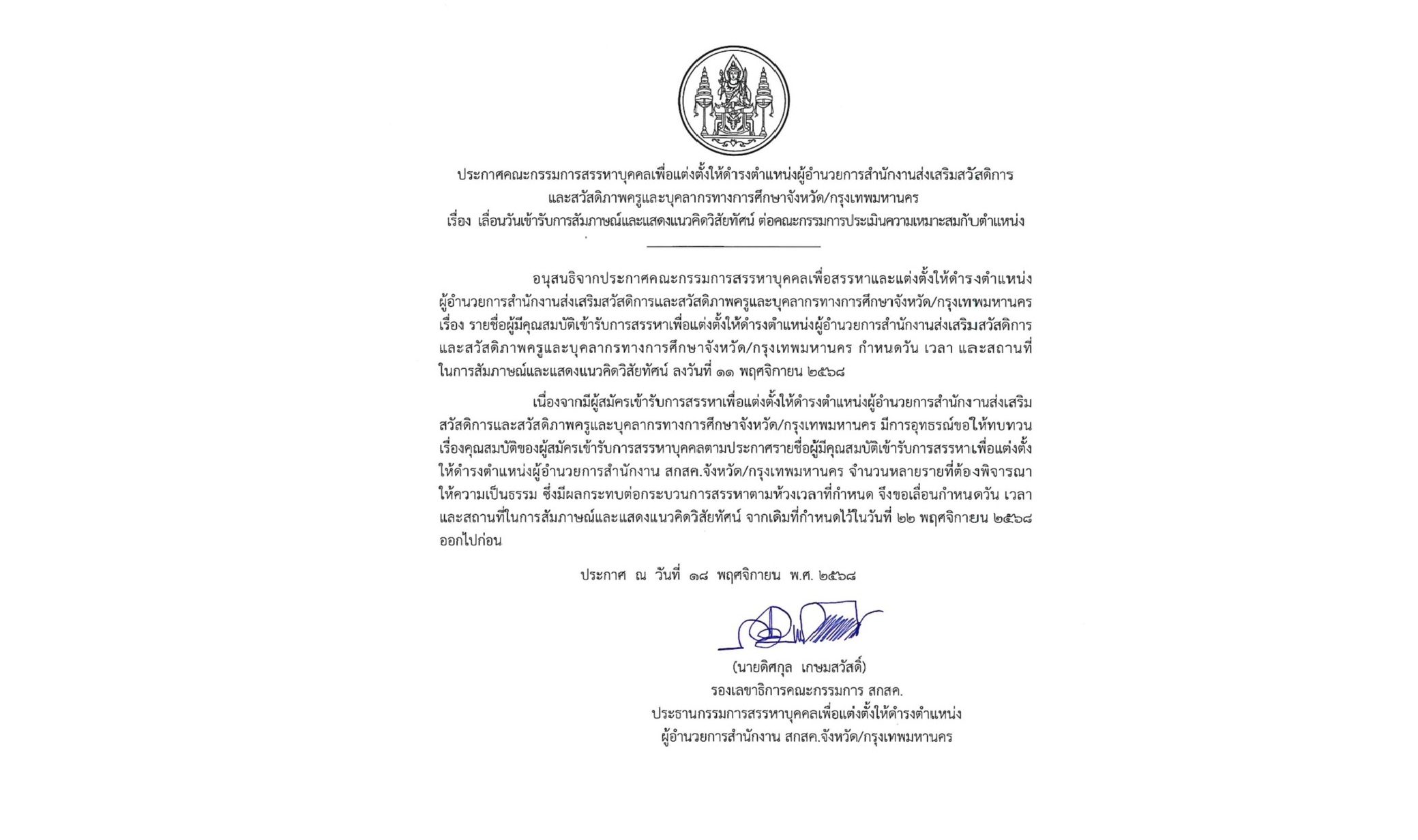 หลังจากมีการเสนอข่าวประกาศ เรื่อง เลื่อนวันเข้ารับการสัมภาษณ์และแสดงแนวคิดวิสัยทัศน์ ต่อคณะกรรมการประเมินความเหมาะสมกับตำแหน่ง ของ คณะกรรมการสรรหาบุคคลเพื่อให้ดำรงตำแหน่งผู้อำนวยการสำนักงานส่งเสริมสวัสดิการและสวัสดิภาพครูและบุคลากรทางการศึกษาจังหวัด/กรุงเทพมหานคร ออกไปอย่างไม่มีกำหนด ที่ลงนามโดย นายดิศกุล เกษมสวัสดิ์ รองเลขาธิการคณะกรรมการ สกสค. ประธานคณะกรรมการสรรหาบุคคลเพื่อแต่งตั้งให้ดำรงตำแหน่ง ผู้อำนวยการสำนักงาน สกสค.จังหวัด/กรุงเทพมหานคร เมื่อวันที่ 18 พ.ย.68 นั้น วันนี้ ( 19 พ.ย.68) ได้มีความเคลื่อนไหวจากองค์กรหรือกลุ่มบุคคลที่ใช้ชื่อว่า “ เครือข่ายครูและบุคลากรทางการศึกษา” ออกมา ชี้ให้เห็นอีกด้านหนึ่งของปรากฎการณ์ที่เกิดขึ้นกับองค์กรครู ว่า