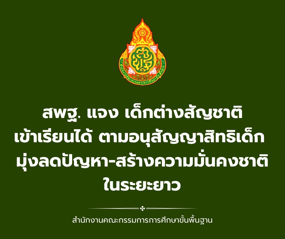 ทั้งนี้ สพฐ. มีความห่วงใยเด็กและเยาวชนในทุกพื้นที่ของประเทศไทย ให้ได้รับการศึกษาขั้นพื้นฐานอย่างครบถ้วน ไม่ว่าเชื้อชาติไหน สัญชาติใด ซึ่งเป็นหลักปฏิบัติสากลที่เป็นไปตามอนุสัญญาว่าด้วยสิทธิเด็ก โดยไม่มีการทอดทิ้งหรือลิดรอนสิทธิของเด็กไทยแต่อย่างใด จึงได้กำชับหน่วยงานในสังกัดให้ดำเนินการรับนักเรียนที่ไม่มีหลักฐานทะเบียนราษฎรหรือไม่มีสัญชาติไทย ให้เป็นไปตามระเบียบ/ประกาศ/แนวปฏิบัติของส่วนราชการ และข้อกฎหมายที่เกี่ยวข้องอื่น ๆ อย่างเคร่งครัด ขอให้ผู้ปกครองและประชาชนมั่นใจว่า จะไม่มีการดำเนินการอันใดที่กระทบกับสิทธิด้านการศึกษาของเด็กไทย และจะมุ่งเสริมสร้างสิทธิเด็กให้มีคุณภาพอย่างยั่งยืนต่อไป