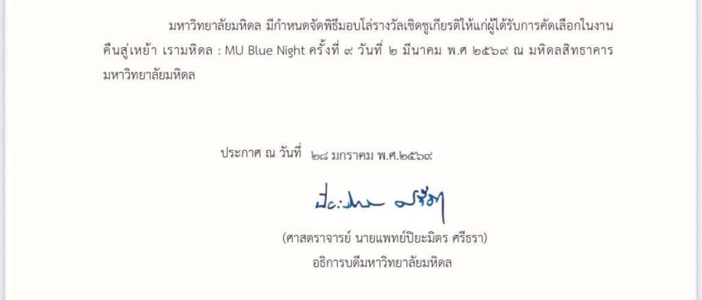 ทั้งนี้ มหาวิทยาลัยมหิดล มีกำหนดจัดพิธีมอบโล่รางวัลเชิดซูเกียรติให้แก่ผู้ได้รับการคัดเลือกในงานคืนสู่เหย้า เรามหิดล : MU Blue Night ครั้งที่ 9 วันที่ 2 มีนาคม พ.ศ.2569 ณ มหิดลสิทธาคาร มหาวิทยาลัยมหิดล