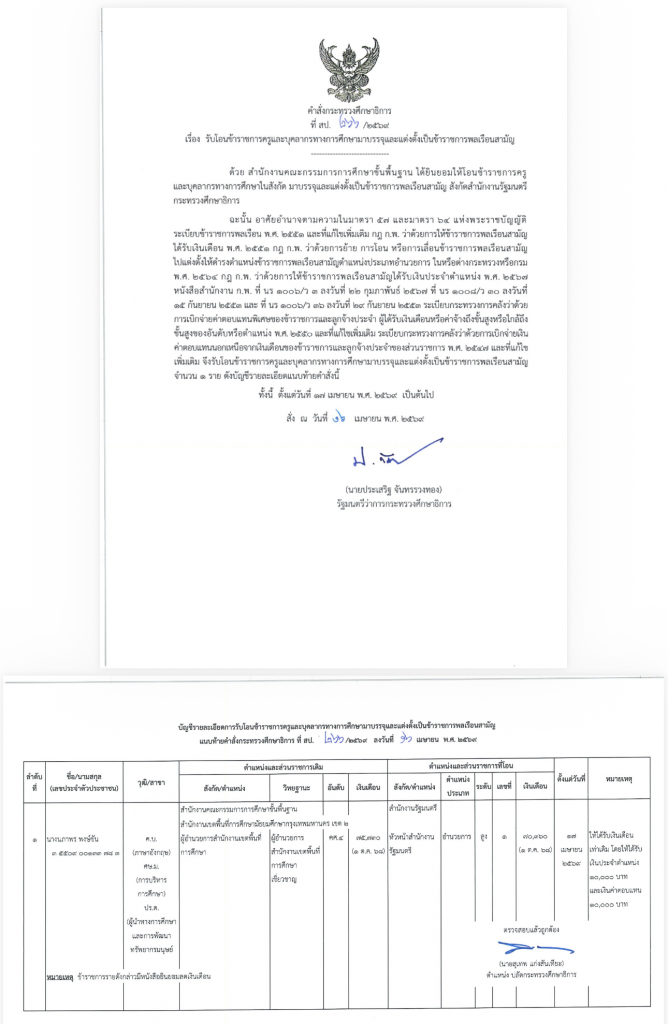 เมื่อวันที่ 16 เมษายน 2569 นายประเสริฐ จันทรรวงทอง รัฐมนตรีว่าการกระทรวงศึกษาธิการได้ออกคำสั่งรับโอนข้าราชการครูและบุคลากรทางการศึกษา จำนวน 1 ราย จากสังกัดสำนักงานคณะกรรมการการศึกษาขั้นพื้นฐาน (สพฐ.) มาบรรจุและแต่งตั้งเป็นข้าราชการพลเรือนสามัญในสังกัดสำนักงานรัฐมนตรี