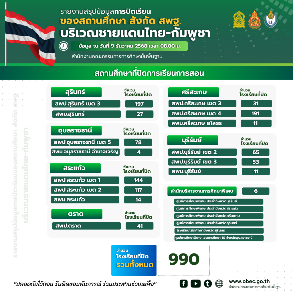 เมื่อเวลา 09.30 น. วันที่ 9 ธันวาคม 2568 ศ.ดร.นฤมล ภิญโญสินวัฒน์ รัฐมนตรีว่าการกระทรวงศึกษาธิการ เปิดเผยความคืบหน้าสถานการณ์ชายแดนไทย–กัมพูชาที่เกิดการปะทะอย่างต่อเนื่องในหลายจุด ส่งผลให้ชุมชนพื้นที่ชายแดนต้องเฝ้าระวังสูงสุด โรงเรียนจำนวนมากได้รับผลกระทบโดยตรง ต้องหยุดการเรียนการสอนชั่วคราวเพื่อความปลอดภัยของนักเรียนและบุคลากรในสังกัด โดยข้อมูลล่าสุดพบว่า สถานศึกษาที่สั่งปิดเรียนชั่วคราวมีทั้งสิ้น 990 แห่ง ครอบคลุมพื้นที่ 6 จังหวัด ได้แก่ สุรินทร์ ศรีสะเกษ บุรีรัมย์ สระแก้ว อุบลราชธานี และตราด ซึ่งส่วนใหญ่อยู่ในพื้นที่ใกล้แนวปะทะและเสี่ยงต่อสถานการณ์ความไม่สงบ ตนได้สั่งการให้สำนักงานเขตพื้นที่การศึกษาในจังหวัดต่าง ๆ เปิดโรงเรียนเป็นศูนย์พักพิงให้แก่บุคลากรทางการศึกษา รวมถึงเด็กนักเรียนและประชาชนในพื้นที่แล้วรวม 22 แห่ง สามารถรองรับประชาชนได้สูงสุด 14,280 คน ซึ่งทุกศูนย์มีการเตรียมพร้อมเครื่องนอน อาหาร น้ำดื่ม ระบบไฟฟ้า ห้องสุขา และพื้นที่ดูแลเด็กเล็กอย่างเต็มที่