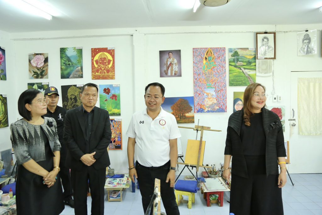 ภายหลังเสร็จสิ้นภารกิจตรวจเยี่ยมสนามสอบ อธิบดี สกร. และคณะได้เข้าเยี่ยมชมพื้นที่ภายในเรือนจำกลางบางขวาง โดยได้ชื่นชมการจัดกิจกรรมส่งเสริมการเรียนรู้และการพัฒนาทักษะของผู้ต้องขังที่เรือนจำได้ดำเนินการอย่างต่อเนื่อง อาทิ กิจกรรมการวาดภาพฝาผนัง ซึ่งมีความสวยงามโดดเด่น สะท้อนถึงความคิดสร้างสรรค์ และการถ่ายทอดเรื่องราวผ่านงานศิลปะได้อย่างน่าประทับใจ รวมถึงได้เยี่ยมชมห้องวาดภาพจิตรกรรม ซึ่งจัดแสดงผลงานศิลปะที่มีความประณีตและงดงามเป็นจำนวนมาก แสดงให้เห็นถึงทักษะ ความสามารถ และศักยภาพของผู้ต้องขังอย่างชัดเจน โดยผลงานบางส่วนได้มีการเปิดให้ผู้ที่สนใจสามารถเลือกซื้อหรือสนับสนุนผลงานได้ รวมถึงสามารถนำภาพหรือแบบที่ต้องการมาให้ผู้ต้องขังวาดตามความประสงค์ เพื่อเป็นการส่งเสริมการฝึกทักษะและต่อยอดสู่การประกอบอาชีพอย่างสร้างสรรค์